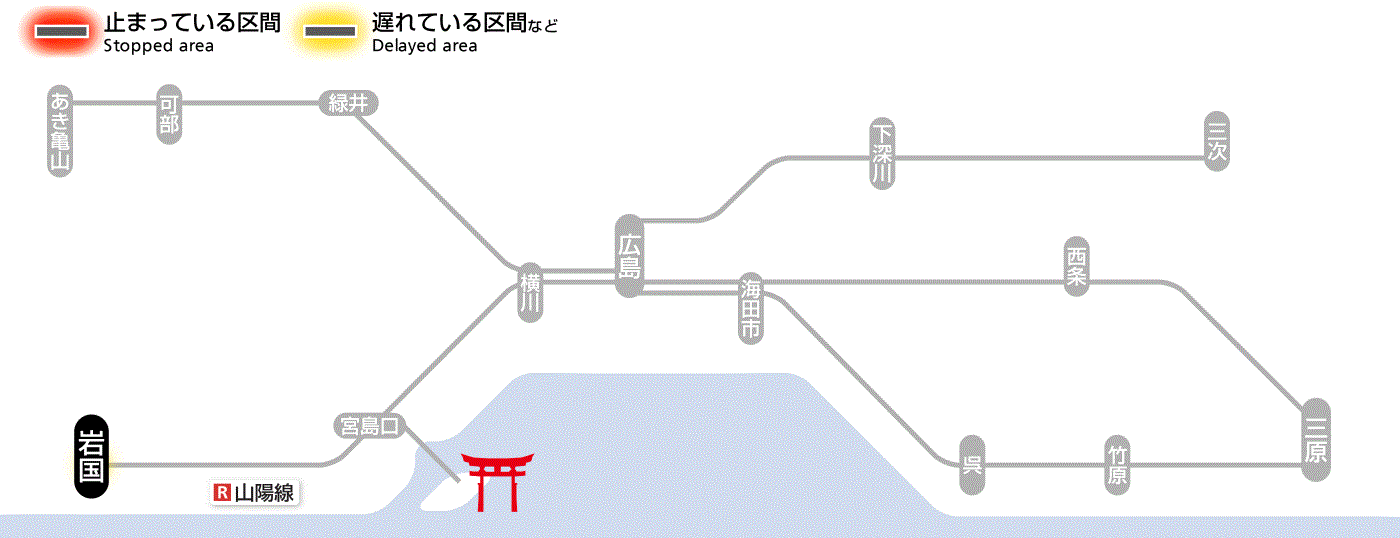 16時45分頃、山陽本線:徳山駅で車両の確認をしたため、一部の列車に運転取り止めがでています。